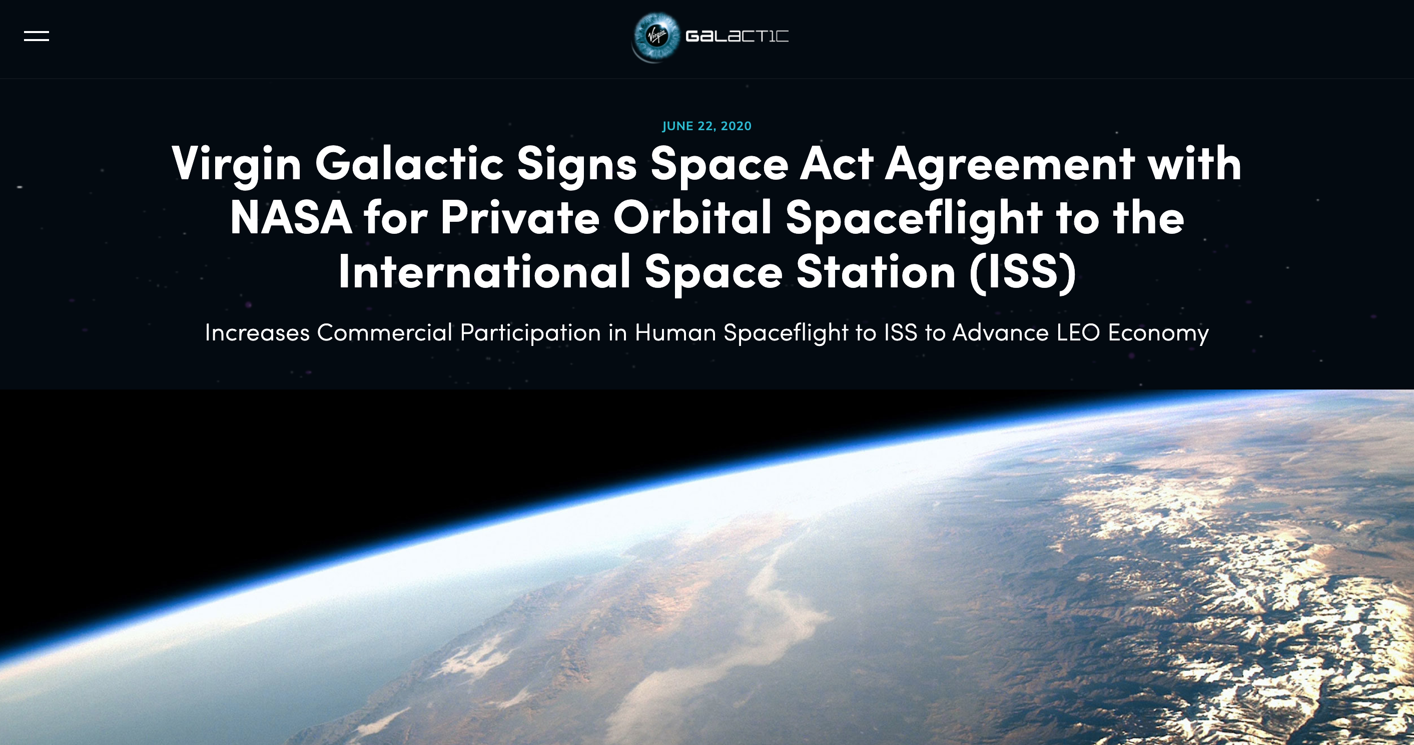 어제 버진 갤럭틱은 홈페이지와 인스타를 통해, NASA와 계약(space act agreement)를 맺었다고 발표했습니다.
