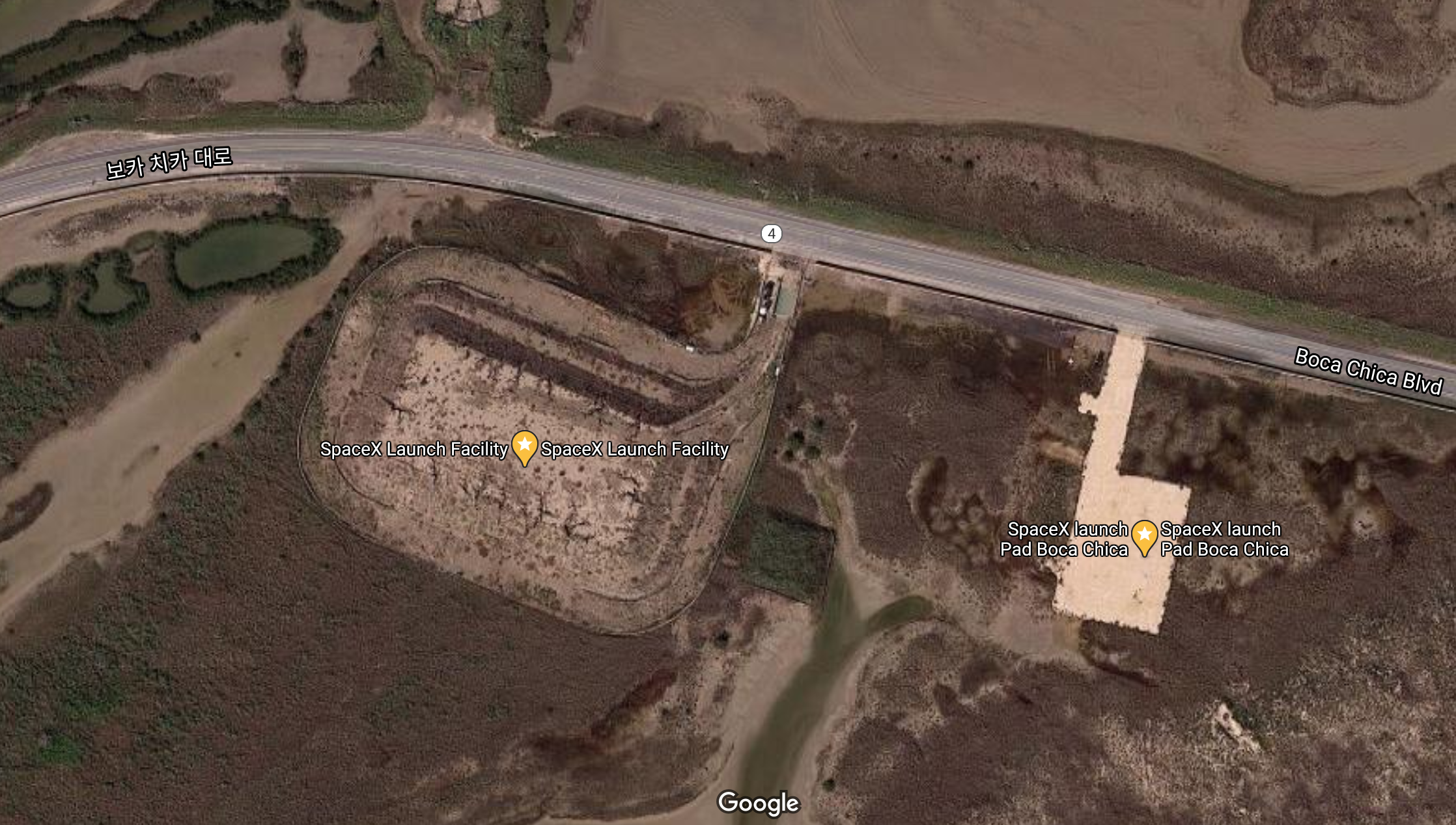 주 도심지를 벗어나 오른쪽에 보이는 보카 치카(Boca Chica) 해변 부근에 스페이스X의 발사장과 관제시설, 그리고 로켓발사장(Launch Pad)가 보입니다. 여기서 스페이스X는 화성으로 사람을 이주시키기 위한 '스타쉽 헤비(starship heavy)' 로켓을 만들고, 테스트 하고 있는 것이죠.