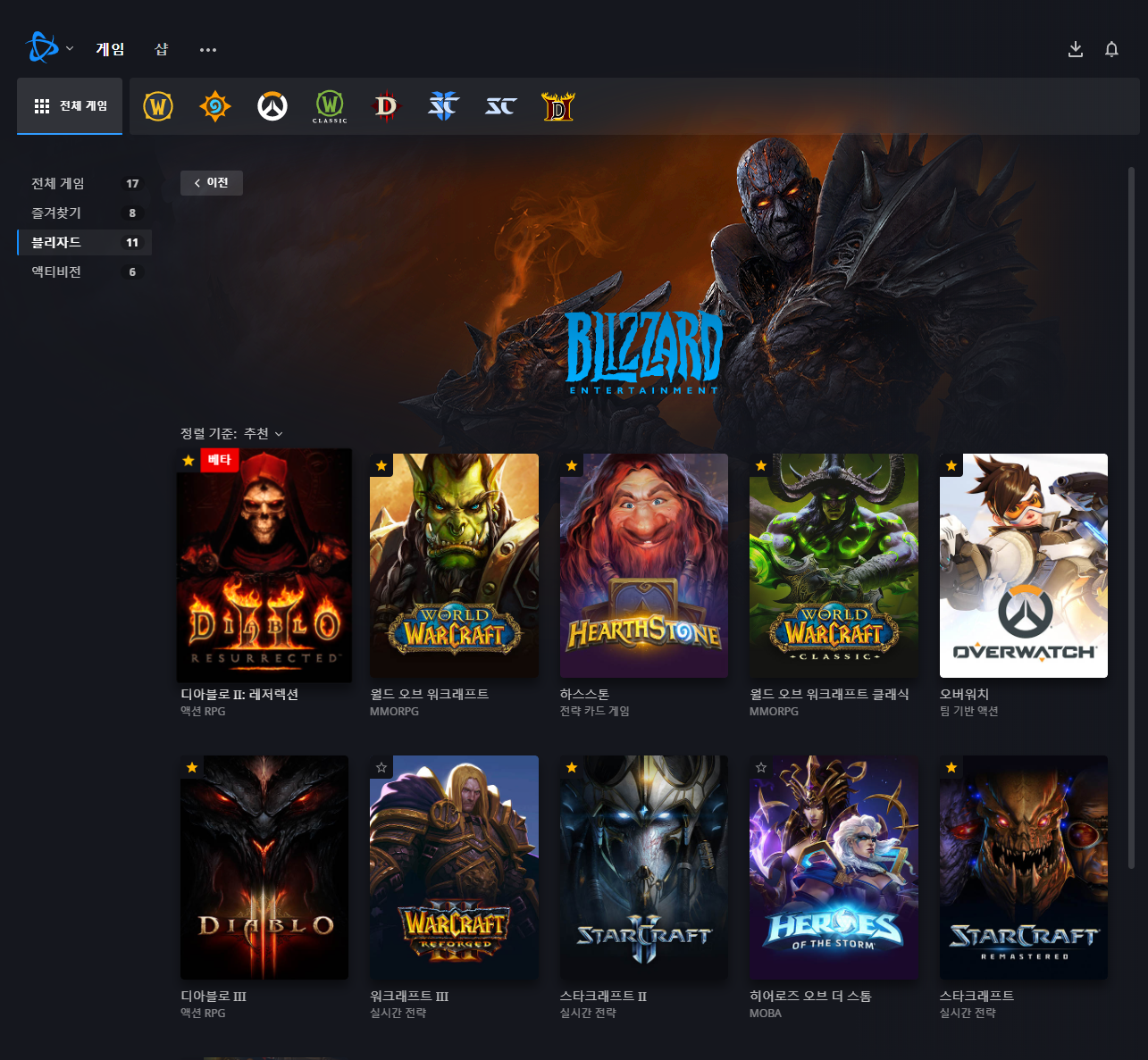 우선 "전체게임 > 블리자드 > 디아블로2:레저렉션"을 클릭합니다