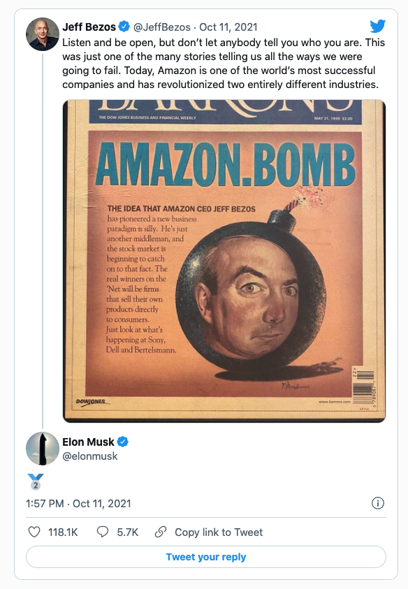 최근에는 테슬라의 주가가 폭등하면서, 일론 머스크가 제프 베조스를 제치고 세계 최고의 부호가 되자, 또 다시 일론 머스크가 제프 베조스의 거룩한 트윗에 댓글을 달며 놀리는 광경이 연출되기도 했죠.