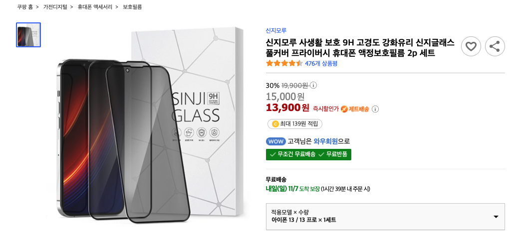 아이폰13용으로는 '신지모루 사생활 보호필름'이 빠르게 출시되어 있어, 아래 제품을 이용하는 것이 좋을 듯 합니다!