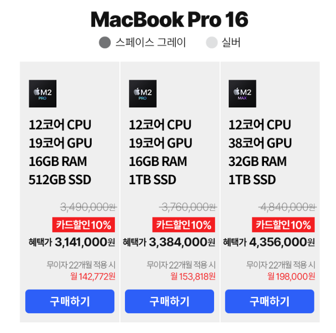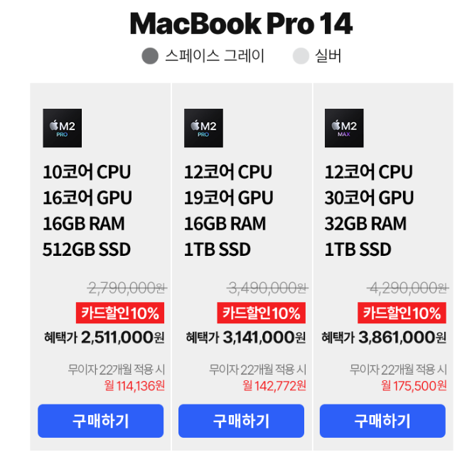 사실 저는 M1이 가격 조절에 실패한 라인업(혹은 의도적으로 저렴하게 보급)이라고 생각하고, M2 맥북프로는 정말정말 미세한 차이 밖에 없고 완전 동일한 외관 스펙을 가지고 있기 때문에, M1 맥북프로를 살 수 있다면, 굳이 M2 맥북프로를 살 이유는 없다고 생각합니다.