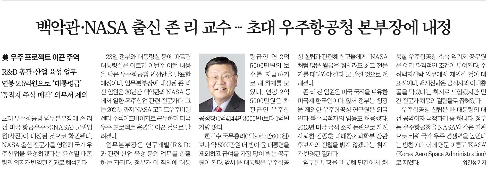 우주항공청 KASA의 본부장에 NASA출신 ‘존 리’라는 분이 내정되었다는 뉴스입니다.