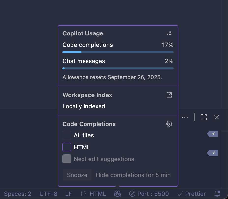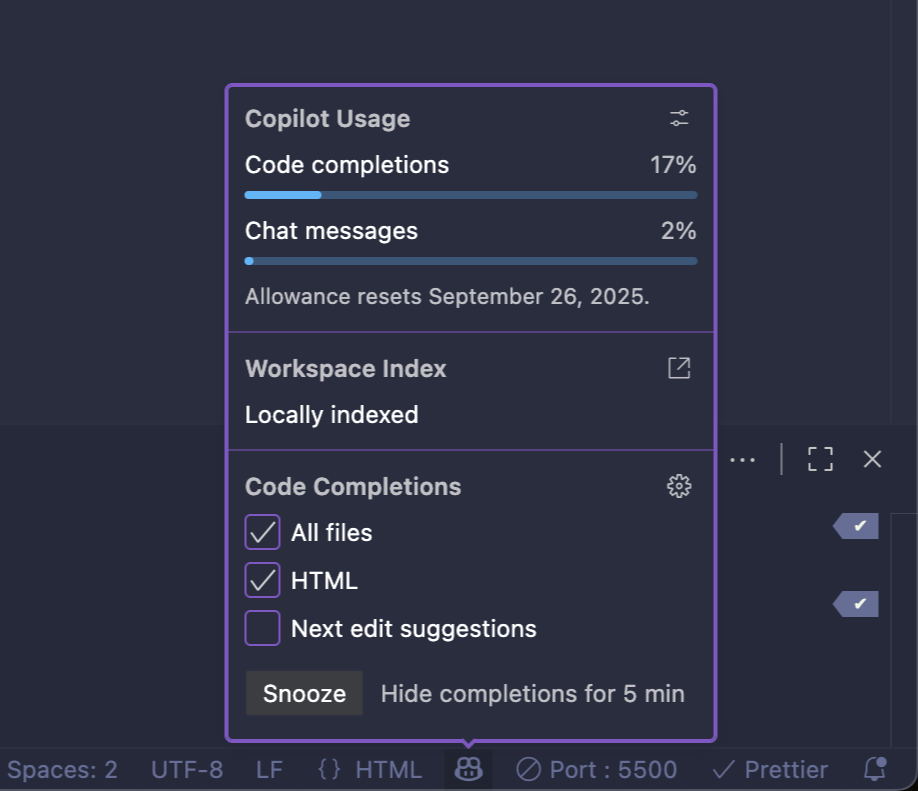 Visual Studio Code 오른쪽 하단에 작은 코파일럿 로고가 있다.