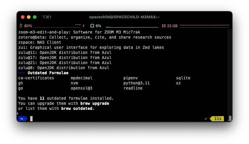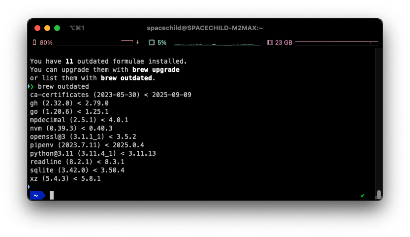 Homebrew 업데이트, Homebrew로 설치한 패키지들도 최신으로 업그레이드 되었는지 확인하려면, 아래 명령어를 치면 된다.